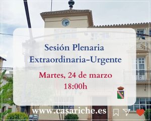 Informamos a todos nuestros vecinos y vecinas que mañana martes 24 de marzo a las 18:00h se celebrará una sesión plenaria de carácter extraordinaria-urgente en