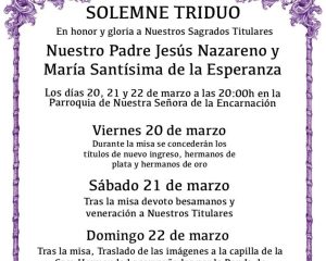 El Ayuntamiento informa de la celebración del Solemne Triduo en honor y gloria de Nuestro Padre Jesús Nazareno y María Santísima de la Esperanza, que