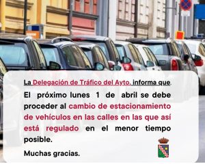 La Delegación de Tráfico del Ayuntamiento recuerda a todos los vecinos y vecinas del municipio que el próximo lunes 1 de abril se realizará el