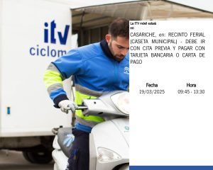 Informamos que la próxima visita a Casariche de la ITV móvil de ciclomotores (motos) está prevista para el próximo miércoles 19 de marzo. Como ya