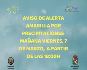 El Ayuntamiento informa que la Agencia Estatal de Meteorología, AEMET, ha activado la alerta amarilla por lluvias en nuestra comarca para mañana 7 de marzo desde