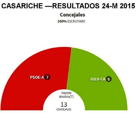 El PSOE de Casariche se ha alzado con la victoria en las elecciones del domingo 24 de Mayo, por lo que continuará al frente del gobierno municipal durante los próximos cuatro años. Han sido un total de 2.090 votos los obtenidos por el PSOE, frente a los 1.596 votos de IULV-CA y los 40 votos del PP, en unos comicios en los que la participación registrada ha sido altísima (87,54%), muy por encima de las medias autonómica (61,23%) y estatal (64,94%).