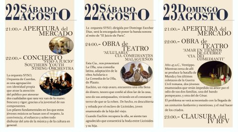 El sábado 22 tendremos a la joven orquesta de cuerda lucentina SYSO a Juicio, que con su frescura serán los encargados de poner la banda sonora al mito “El Juicio de Paris” y más tade la Asociación de Teatro Comediantes Malagueños, nos trasladará con la comedia latina “La Olla” a la Antigua Roma.
