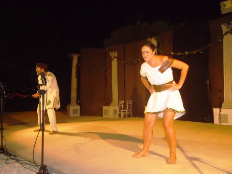 Después, a las doce de la noche, fue la Asociación Teatral de Comediantes Malagueños, quien nos trasladó a las Antigua Roma con su obra de teatro La Olla, adaptada y dirigida por Cristina Navarro sobre el original de Plauto. Esta comedia latina, que es un derroche de diversión pura, nos contó la historia de Euclión, un viejo avaro, que encontró una olla llena de dinero, tesoro que confió al dios lar de la casa uno de sus antepasados, y que vivía en el constante terror de que se la robasen. De hecho, finalmente la olla fue descubierta y robada por el esclavo de Licónides, un joven enamorado de la hija de Euclión. Cuando Euclión recuperó la olla, se sintió tan agradecido que consintió la boda entre Licónides y su hija.