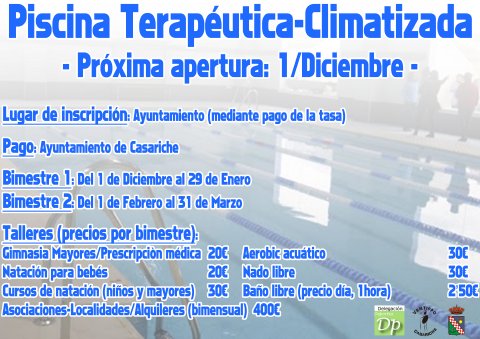 La piscina Terapéutica – Climatizada de Casariche va a iniciar la temporada el próximo 1 de Diciembre y ya está abierto el plazo de inscripción en los distintos talleres que se pondrán en marcha, como en años anteriores, de carácter bimestral.