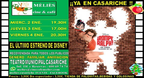 Estos próximos días no puedes perderte en último estreno de Disney, Rompe Ralph, que llegaa a Casariche del miércoles 2 al viernes 4 de Enero.