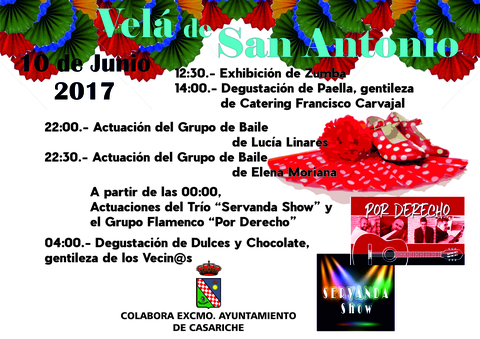 Este sábado 10 de Junio, llega a nuestro municipio la esperada Velá de San Antonio 2017. Este año se conmemora su 25 aniversario y, como novedad, la celebración comenzará al mediodía con una exhibición de zumba y una degustación de paella.