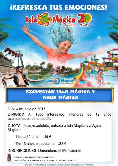 El Ayuntamiento de Casariche, a través de sus Delegaciones de Bienestar Social y Juventud y de Proyecto Ribete, ha organizado una excursión a Isla Mágica y Agua Mágica para el próximo 4 de Julio.