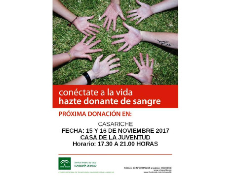 El MIÉRCOLES 15 y el JUEVES 16 de NOVIEMBRE habrá una nueva campaña de donación de sangre en CASARICHE. Como de costumbre, será en la CASA DE LA JUVENTUD en horario de 17.30 a 21.00 horas.