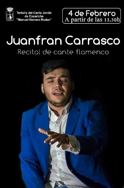 Este domingo día 4 de Febrero, a las 13:30 horas, la Tertulia del Cante Jondo «Manuel Herrera Rodas» acogerá un recital de cante flamenco a cargo de Juanfran Carrasco.