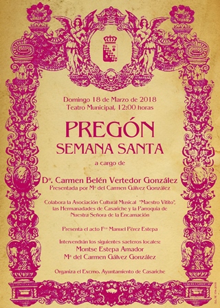 El Teatro Municipal de Casariche acogerá este domingo 18 de Marzo, a partir de las doce del mediodía, el Pregón de la Semana Santa de Casariche 2018, a cargo de Carmen Belén Vertedor González, que será presentada por Mª del Carmen Gálvez González.