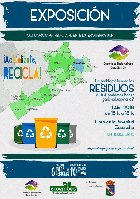 La Casa de la Juventud de nuestro municipio acogerá el miércoles 13 de Abril, de 16:00 a 18:00 horas, la exposición “Actualízate, Recicla”, puesta en marcha por el Consorcio de Medio Ambiente Estepa – Sierra Sur y Ecoembes, y que cuenta con la colaboración del Ayuntamiento de Casariche.
