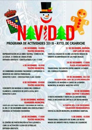 La Delegación de Cultura del Ayuntamiento ya tiene preparada la Programación Navideña 2018 en Casariche, que arranca el día 1 de Diciembre con el teatro de Crisol-Aydis y concluirá con la tradicional Cabalgata de Reyes en la tarde del 5 de Enero.