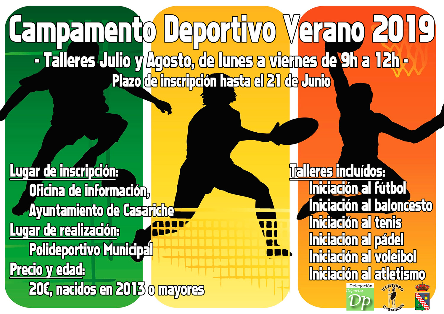 Ya se ha abierto el plazo de inscripción en el Campamento Deportivo Veraniego 2019, que incluirá talleres, durante los meses de Julio y Agosto, de iniciación a las siguientes disciplinas deportivas: fútbol, baloncesto, tenis, pádel, voleibol y atletismo, dirigidos a nacidos en 2013 o mayores.