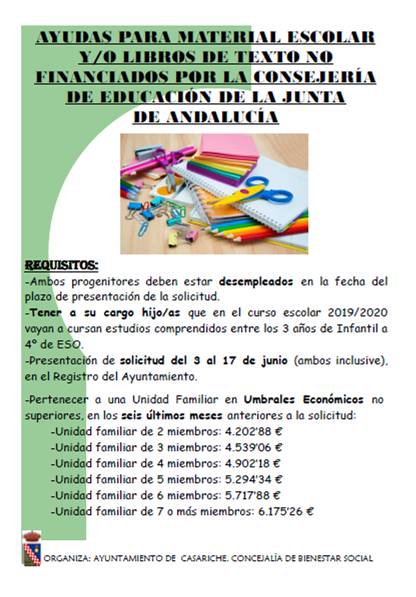 El Ayuntamiento de Casariche ha puesto en marcha la convocatoria de ayudas para material escolar y/o libros de texto no financiados por la Consejería de Educación de la Junta de Andalucía para los cursos escolares comprendidos desde Educación Infantil de 3 años hasta 4º de ESO (curso 2019-2020).