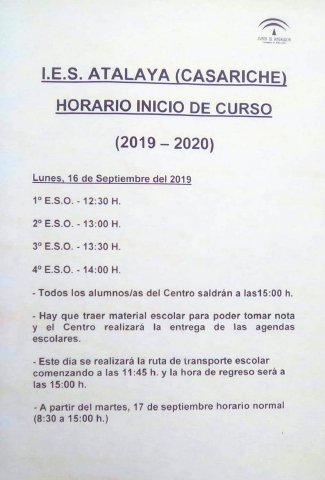 Las clases en el IES Atalaya de nuestro municipio comienzan el lunes 16 de Septiembre, fecha en que arranca el curso 2019/2020 para el alumnado de ESO, Bachillerato y FP. Ese primer día la entrada se hará de forma escalonada por cursos, en los siguientes horarios, y la salida para todo el alumnado del centro será a las 15:00 h: