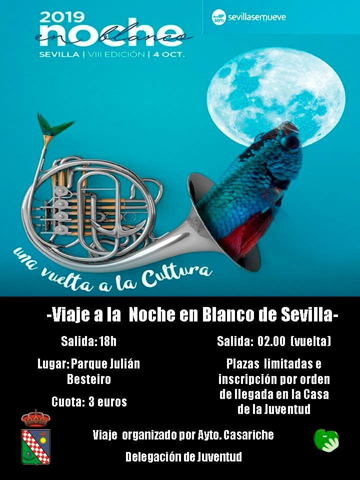 Para el próximo viernes día 4 de Octubre, desde la Delegación de Juventud del Excmo. Ayuntamiento de Casariche nos presentan un viaje para disfrutar de la «Noche en Blanco«, con la intención de conocer con mayor profundidad la maravillosa ciudad de Sevilla.