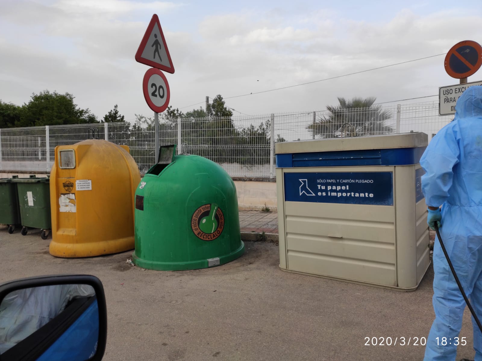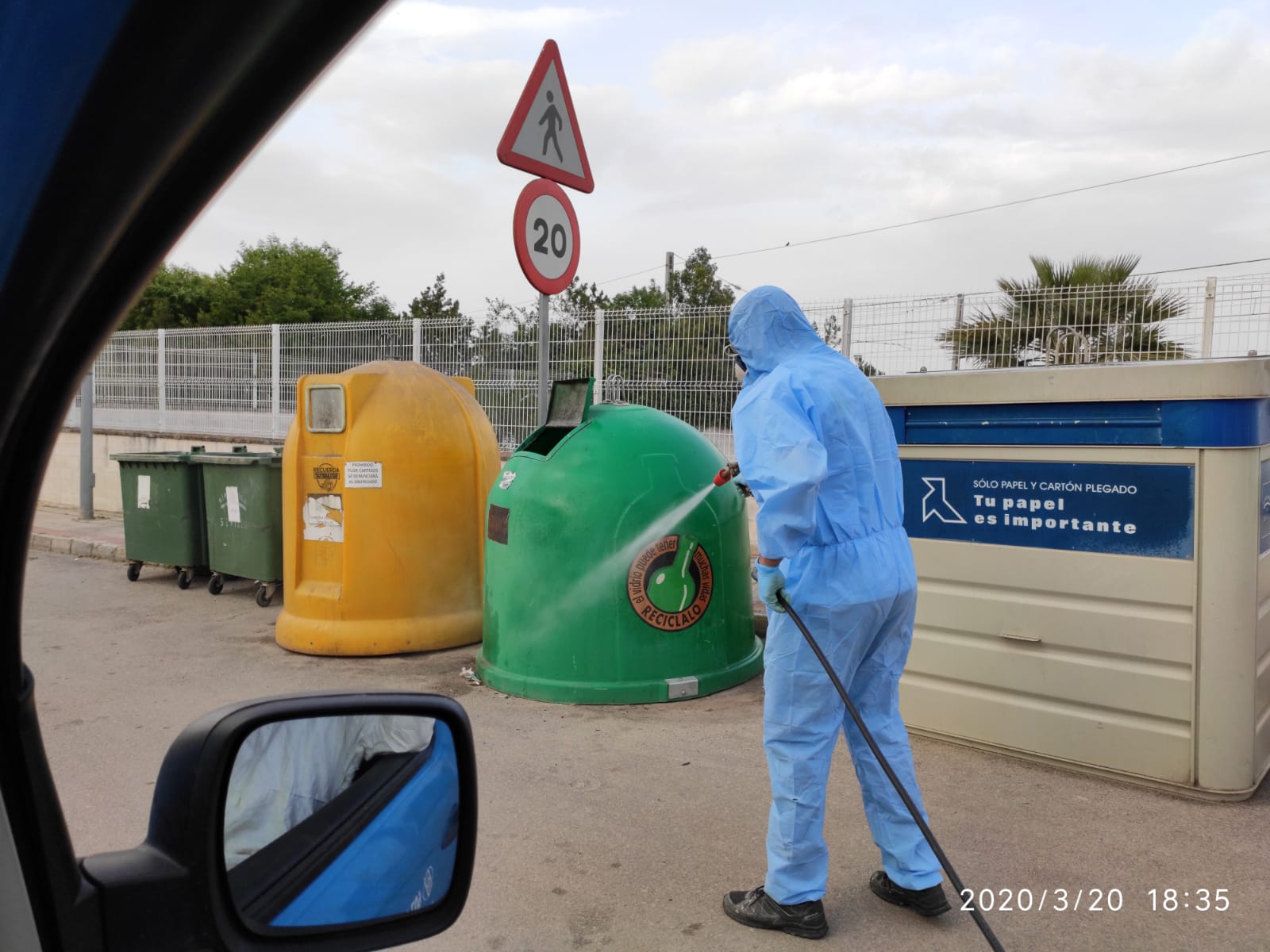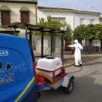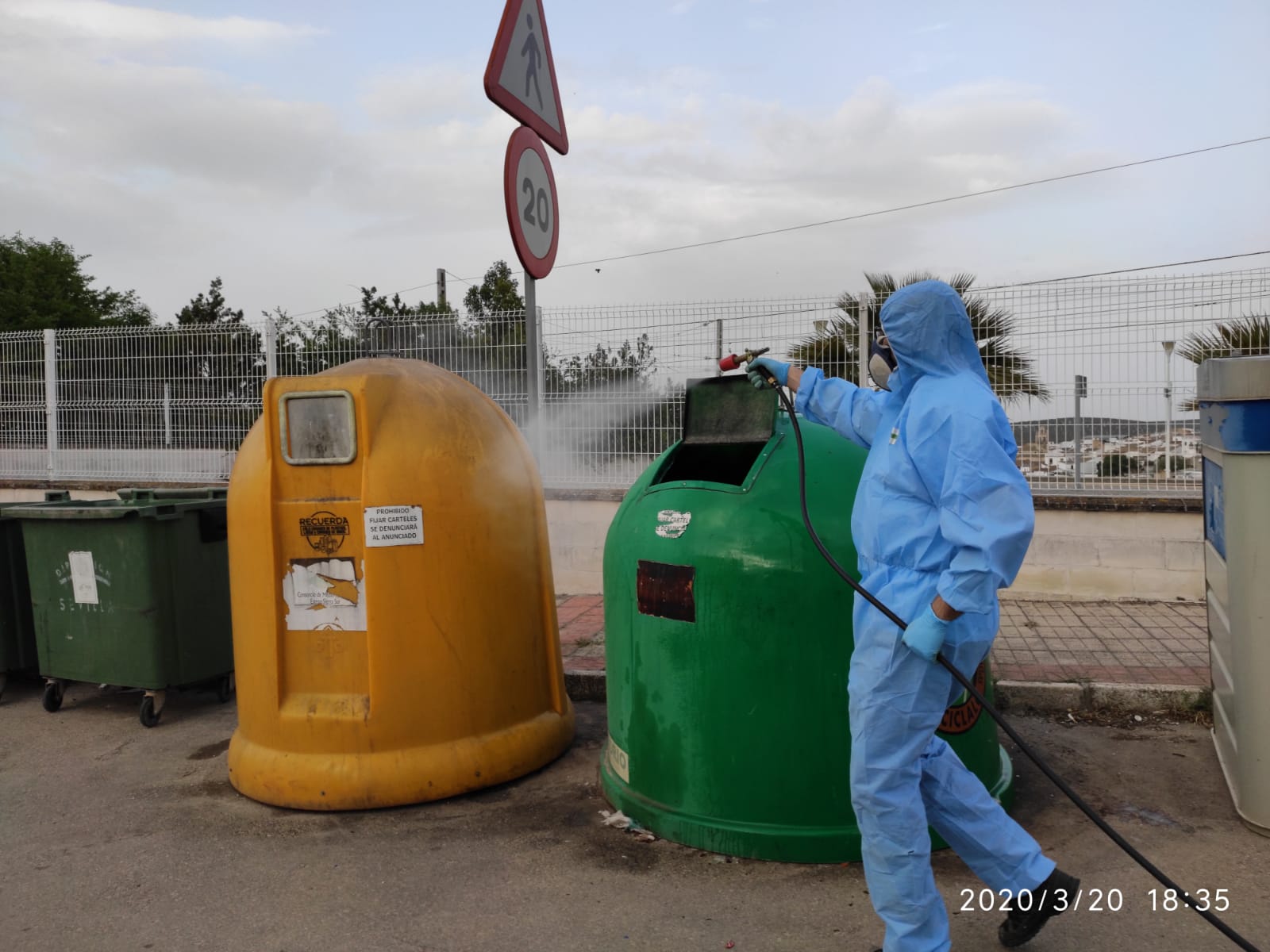 Son varios operarios de una empresa especializada junto con diferentes equipos municipales de personal de servicio, los que están ejecutando las labores de limpieza y desinfección manual y con hidrolimpiadora de las calles y plazas del municipio, del mobiliario urbano, del acerado y de las islas de contenedores. Haciéndose más profundas en las zonas de más concurrencia, como el Centro de Salud y los comercios de alimentación y farmacias.