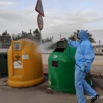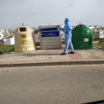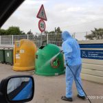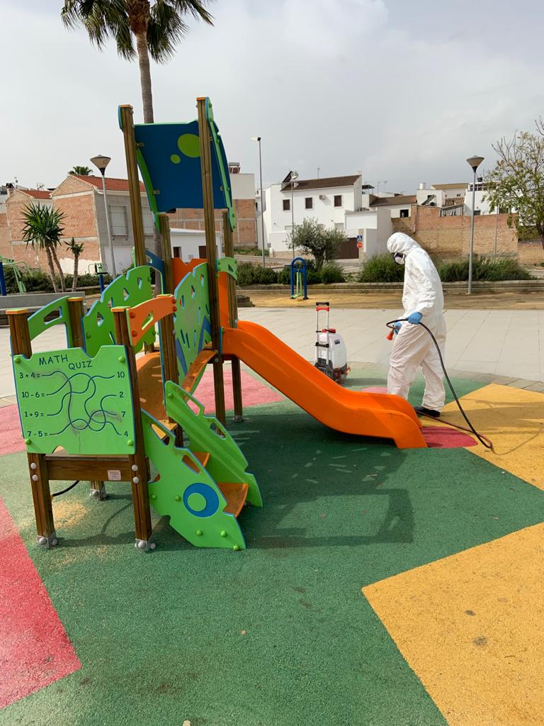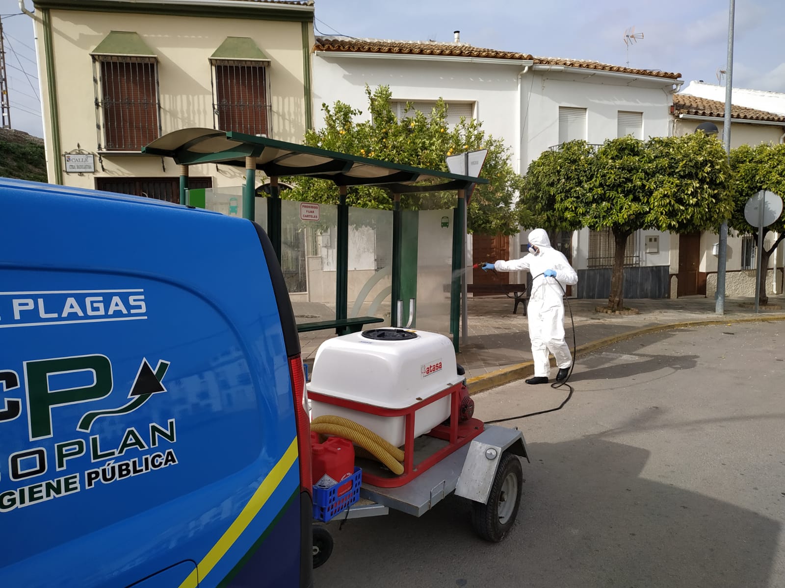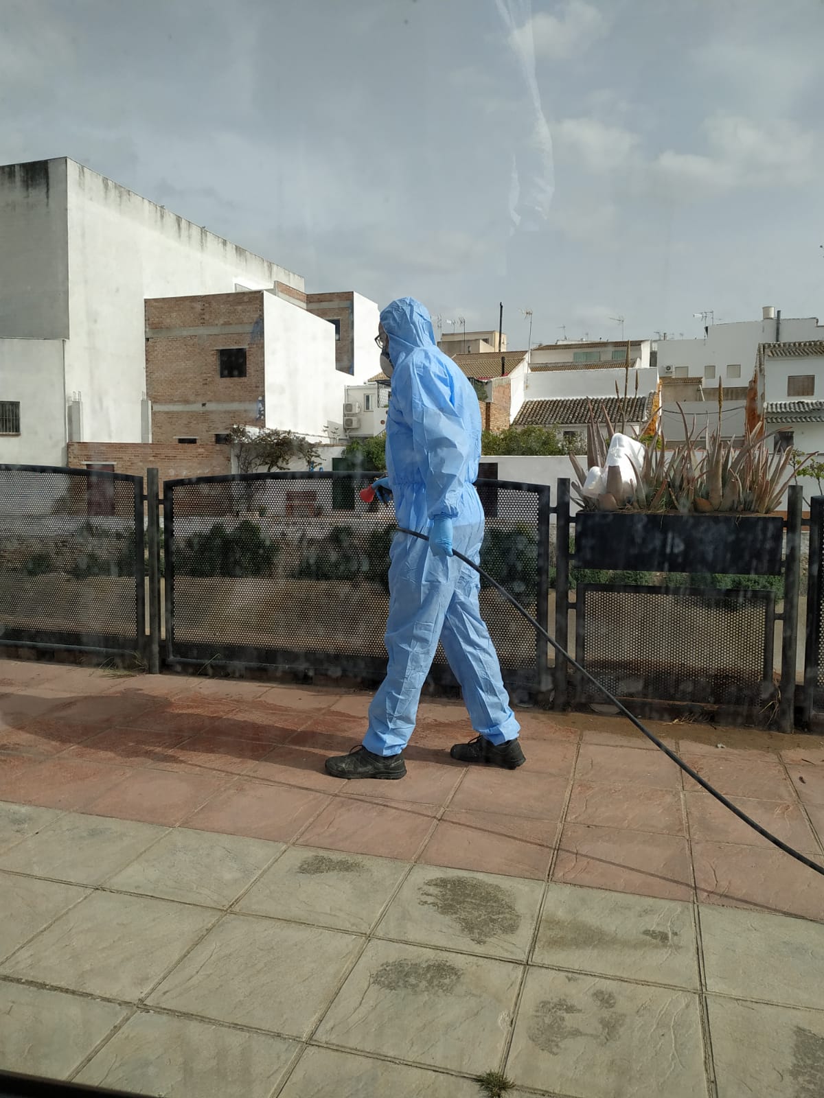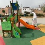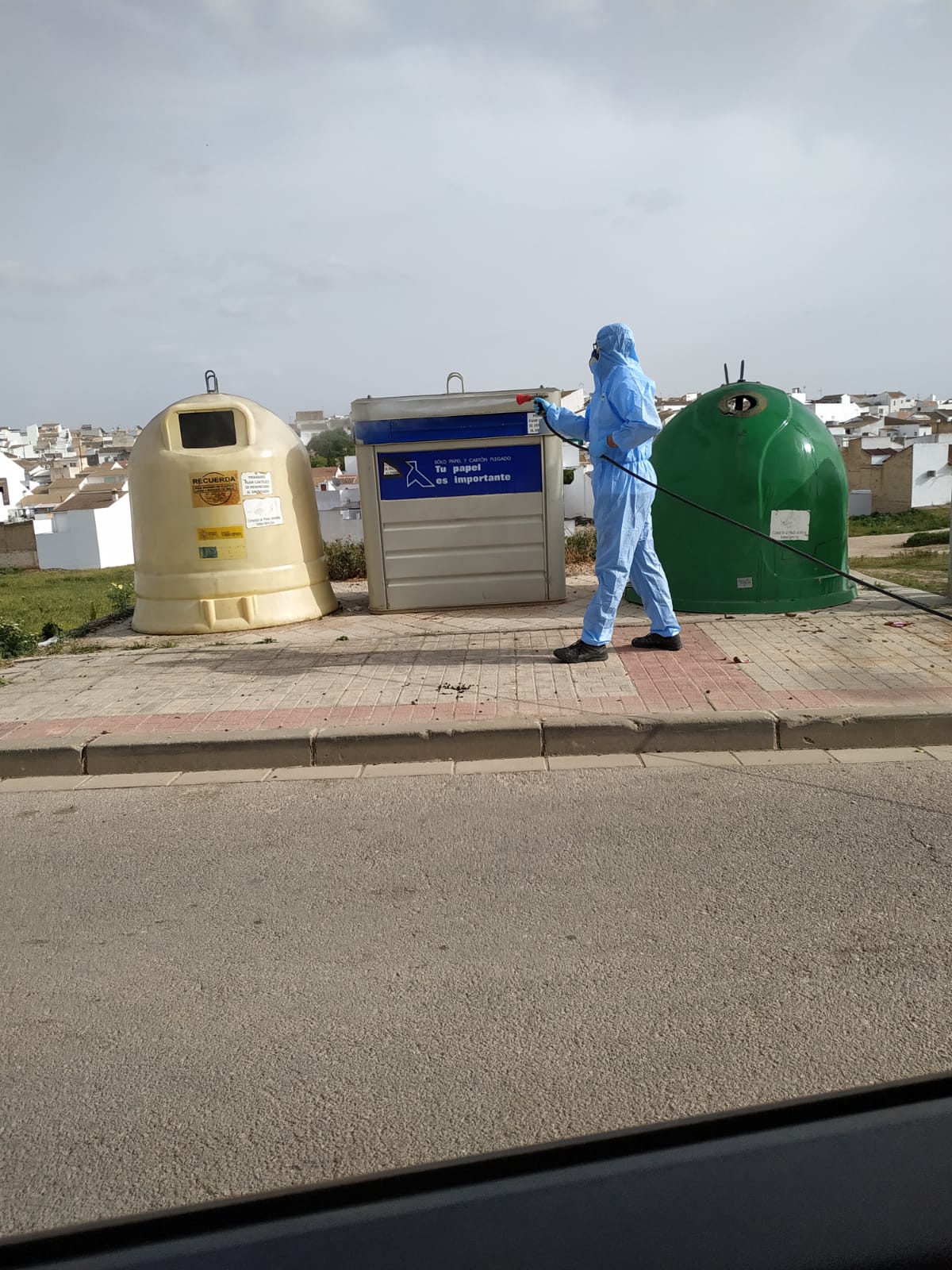 Son varios operarios de una empresa especializada junto con diferentes equipos municipales de personal de servicio, los que están ejecutando las labores de limpieza y desinfección manual y con hidrolimpiadora de las calles y plazas del municipio, del mobiliario urbano, del acerado y de las islas de contenedores. Haciéndose más profundas en las zonas de más concurrencia, como el Centro de Salud y los comercios de alimentación y farmacias.