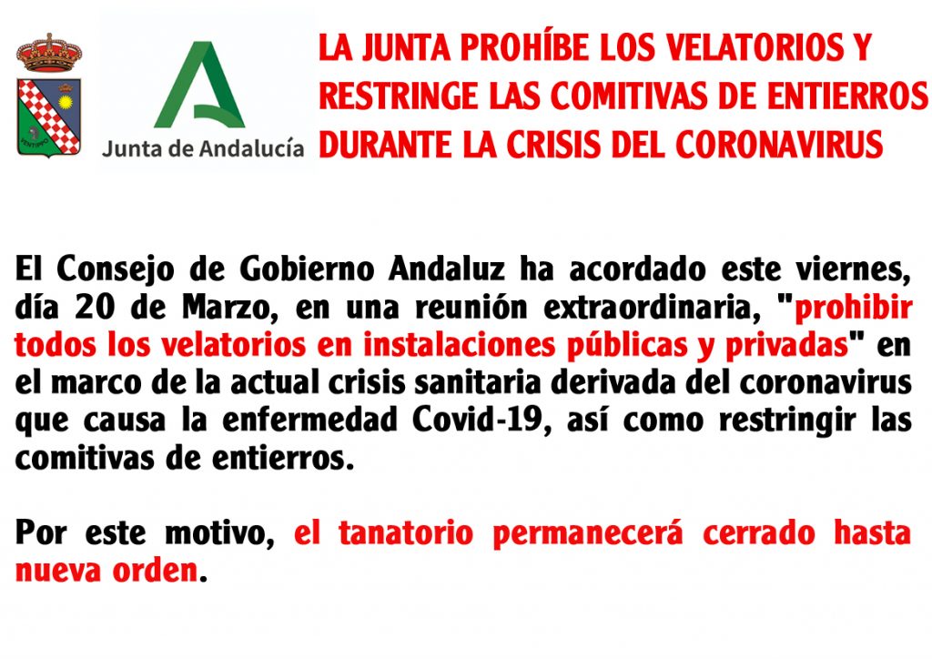 El Consejo de Gobierno Andaluz ha acordado este viernes, día 20 de Marzo, en una reunión extraordinaria, «prohibir todos los velatorios en instalaciones públicas y privadas» en el marco de la actual crisis sanitaria derivada del coronavirus que causa la enfermedad Covid-19, así como restringir las comitivas de entierros.