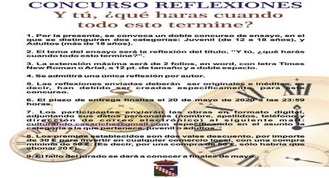 Desde aquí, os animamos a participar con vuestras reflexiones. Recordad que el plazo está abierto hasta el próximo día 20 de Mayo y que la dirección de envío para participar en este concurso es: culturando.casariche@gmail.com