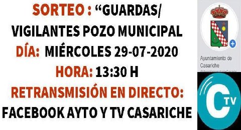 Este miércoles 29 de Julio, a las 13:30 h, se va a realizar el sorteo para “Guardas/Vigilantes para pozo municipal».