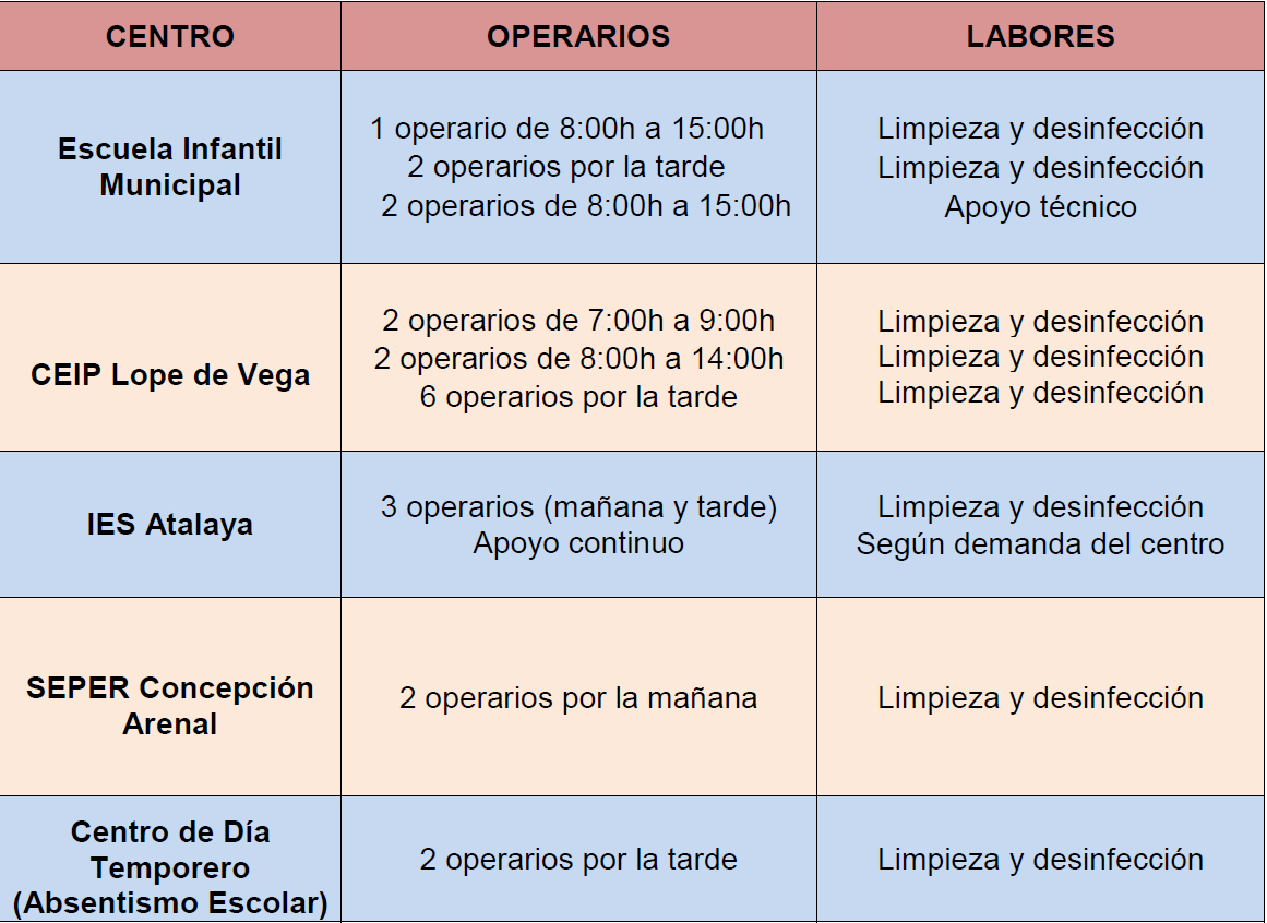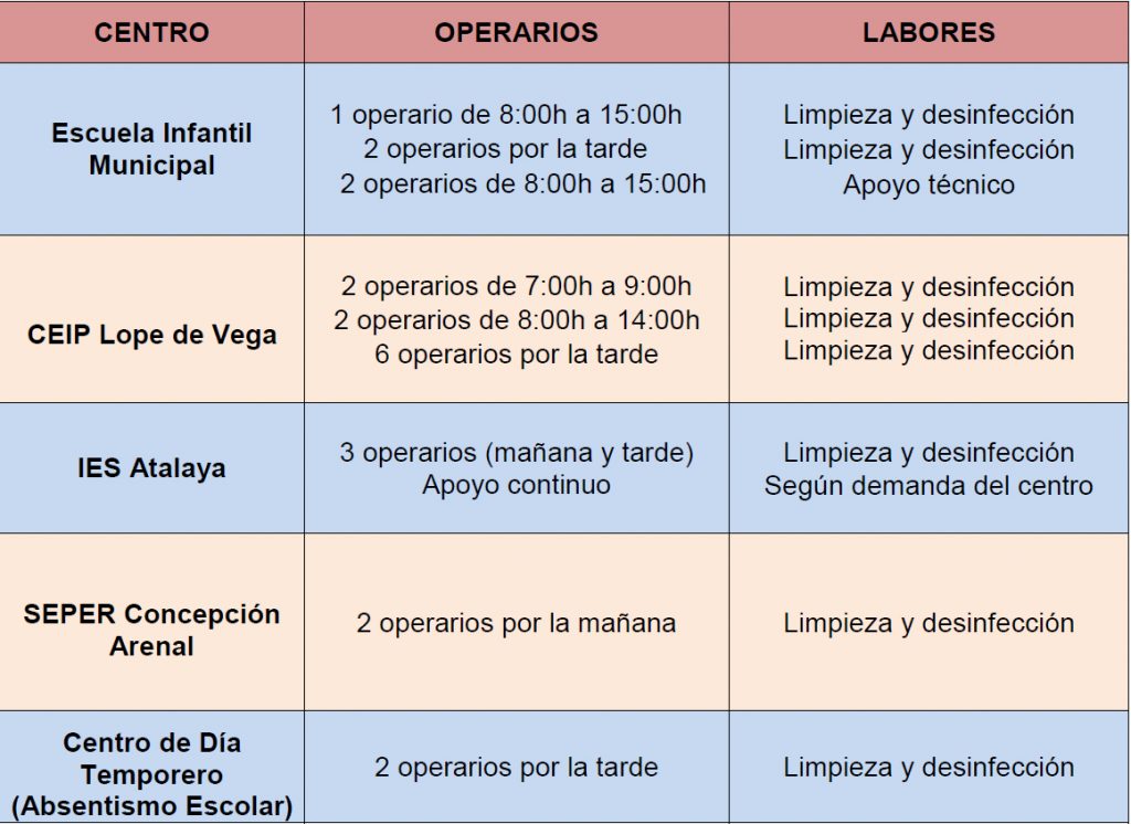Aquí os dejamos un cuadrante resumen de las labores de limpieza y desinfección para los Centros Educativos en el curso escolar 2020/2021: