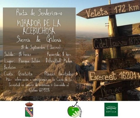 El jueves 10 de Septiembre te invitamos a participar en la primera de la temporada: la ruta al Mirador de la Acebuchosa en la Sierra de Gilena, una actividad que te permitirá admirar una bonita puesta de sol a la vez que hacer ejercicio físico.