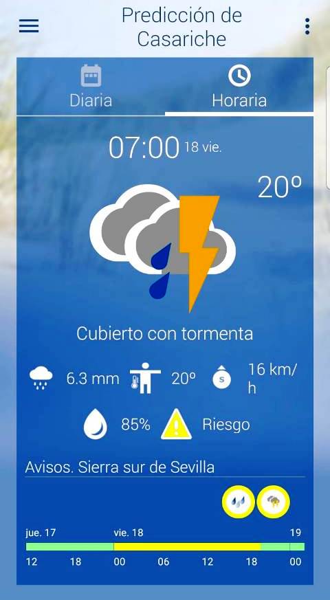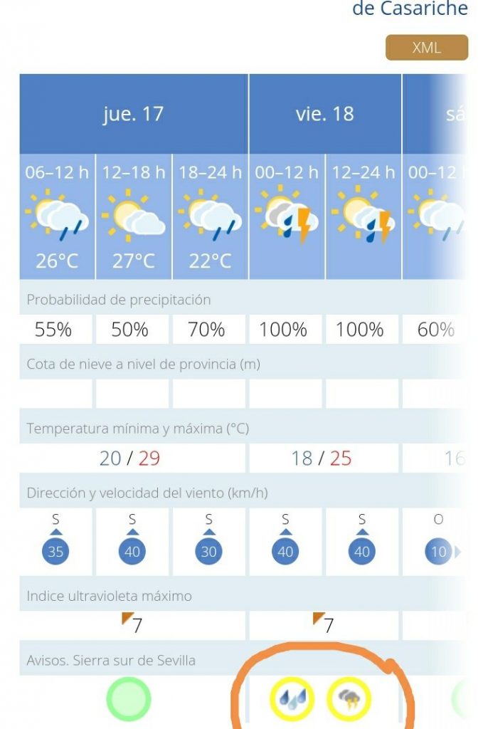 La Agencia Estatal de Meteorología (AEMET) lanza una alerta amarilla por riesgos de lluvias y tormentas en Casariche mañana 18 de Septiembre desde las 00.00 h (esta madrugada) hasta las 18:00 horas.