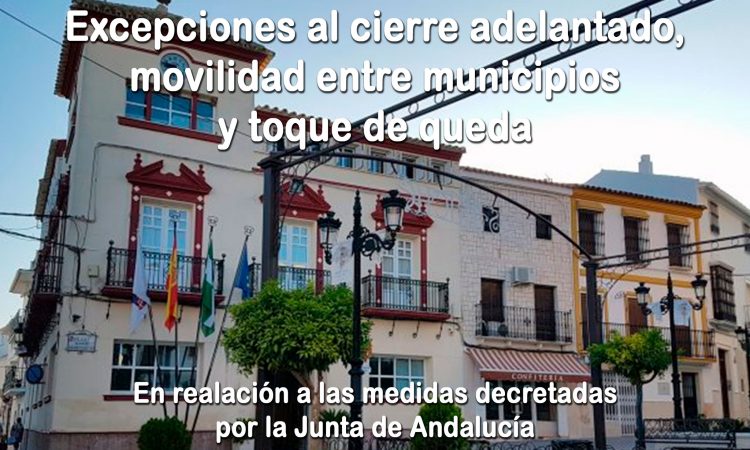 En la noche del pasado domingo día 8 de noviembre se publicó un BOJA por parte de la Junta de Andalucía que establecía nuevas medidas restrictivas frente al coronavirus cuya aplicación estará vigente hasta el 23 de noviembre (revisable). La aplicación de varias de estas medidas tienen algunas excepciones, las cuales damos a conocer a continuación en función de su ámbito de aplicación (cierre adelantado de comercios y otros establecimientos a la 18:00 horas, restricciones de movilidad entre municipios y toque de queda).