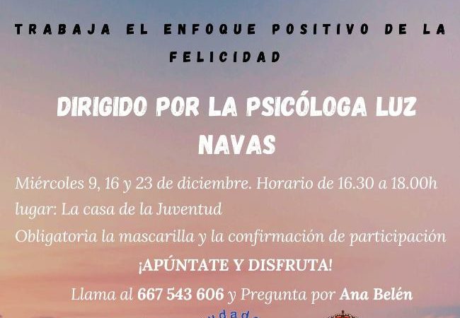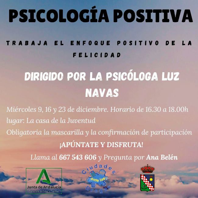 Casariche ante las Drogas ha organizado un Taller sobre Psicología Positiva, que será conducido por la psicóloga Luz Navas, y se llevará a cabo en la Casa de la Juventud, de 16:30 a 18:00 h durante los miércoles 9, 16 y 23 de Diciembre de 2020.