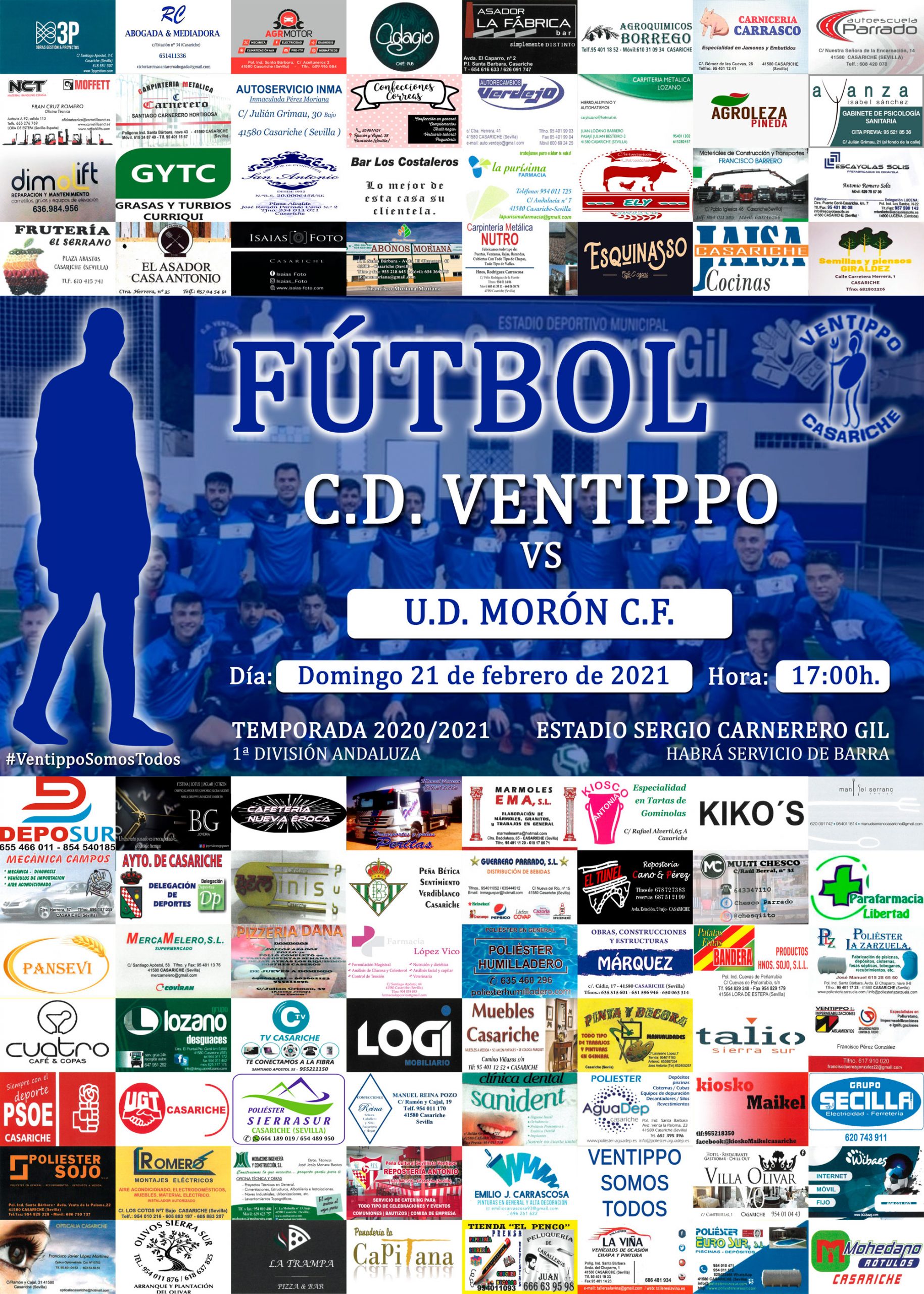 Por otro lado, nuestros seniors juegan el domingo 21 en el Sergio Carnerero Gil, a las 17:00 h, contra el UD Morón CF. La semana pasada, el CD Ventippo senior hizo doblete disputando dos encuentros, uno atrasado, que concluyó con una nueva victoria para los nuestros (CD Ventippo 1 – 0 Estrella San Agustín CD) y el correspondiente a la actual jornada de liga, que se saldó con un empate (CD Atlético Dos Hermanas CF 1 – 1 CD Ventippo).