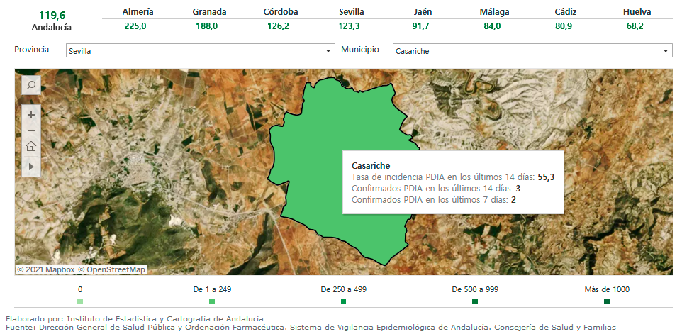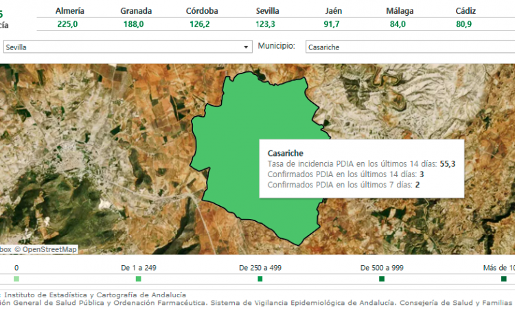El Instituto de Estadística y Cartografía de Andalucía y la Consejería de Salud y Familias han publicado las nuevas cifras oficiales de la evolución de la pandemia derivada de la COVID19, en las que no se registran nuevos contagios en Casariche durante las últimas 24 horas.