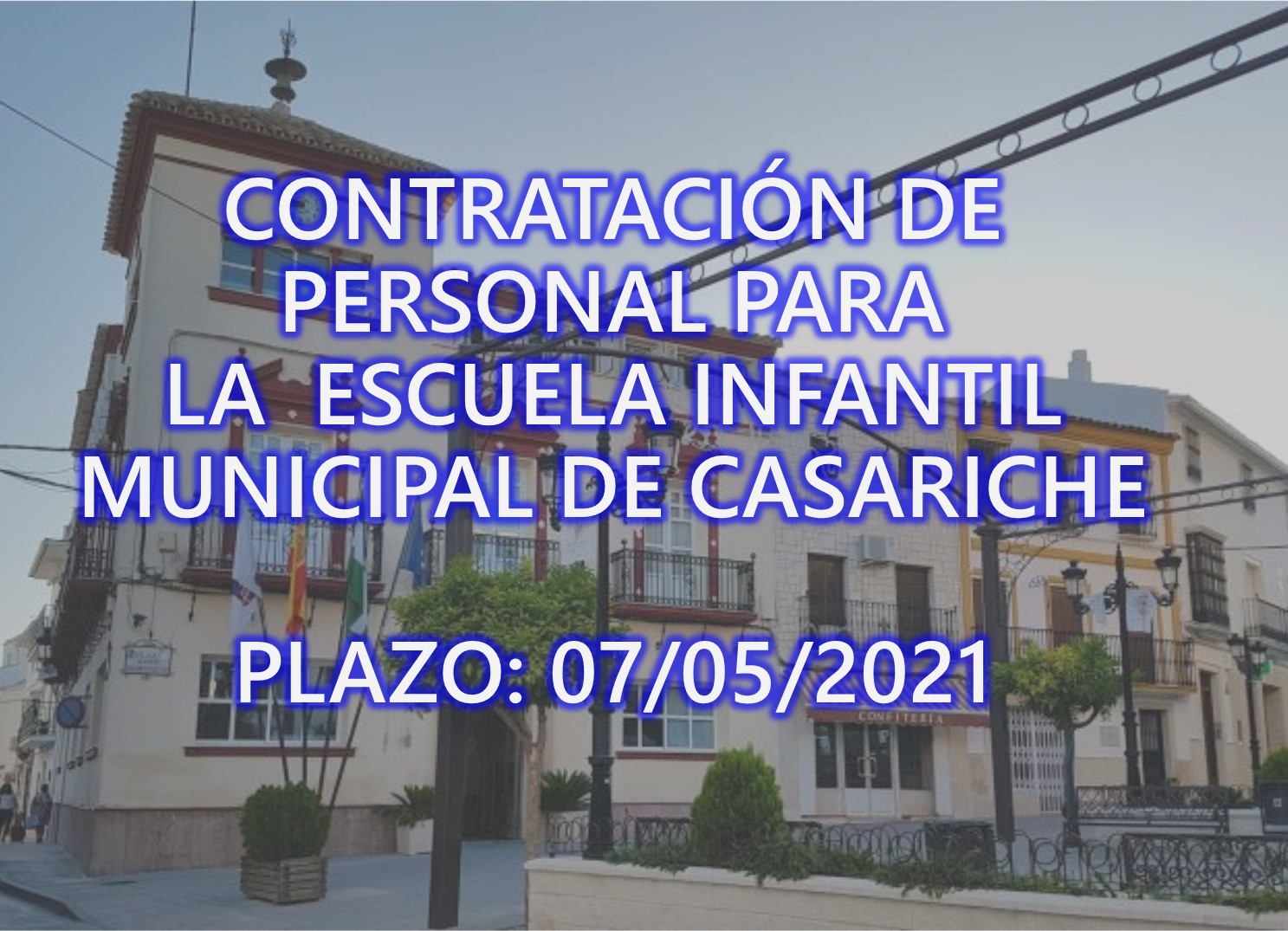 Desde hoy 26 de Abril y hasta el 7 de Mayo de 2021 (ambos incluidos) estará abierto el plazo de entrega de solicitudes para la «CONTRATACIÓN DE PERSONAL PARA LA ESCUELA INFANTIL MUNICIPAL DEL EXMO. AYUNTAMIENTO DE CASARICHE«