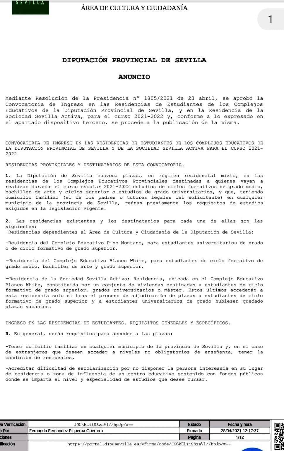 El Ayuntamiento informa que el plazo de presentación de solicitudes de ingreso en las residencias de estudiantes de la Diputación Provincial de Sevilla (Residencia Pino Montano, Sevilla Activa y Residencia Blanco White) de cara al curso 2021/2022 estará abierto hasta el próximo 14 de de Mayo de 2021 (incluido).