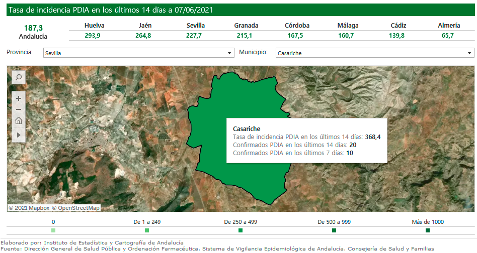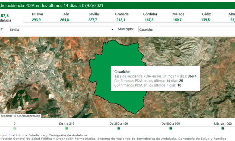 La tasa de contagio de Casariche baja hasta los 368’4 casos por cada 100.000 habitantes. Los «casos activos positivos» de los últimos 7 días han subido hasta los 10 casos, mientras que en los últimos 14 días han bajado hasta los 20 casos.
