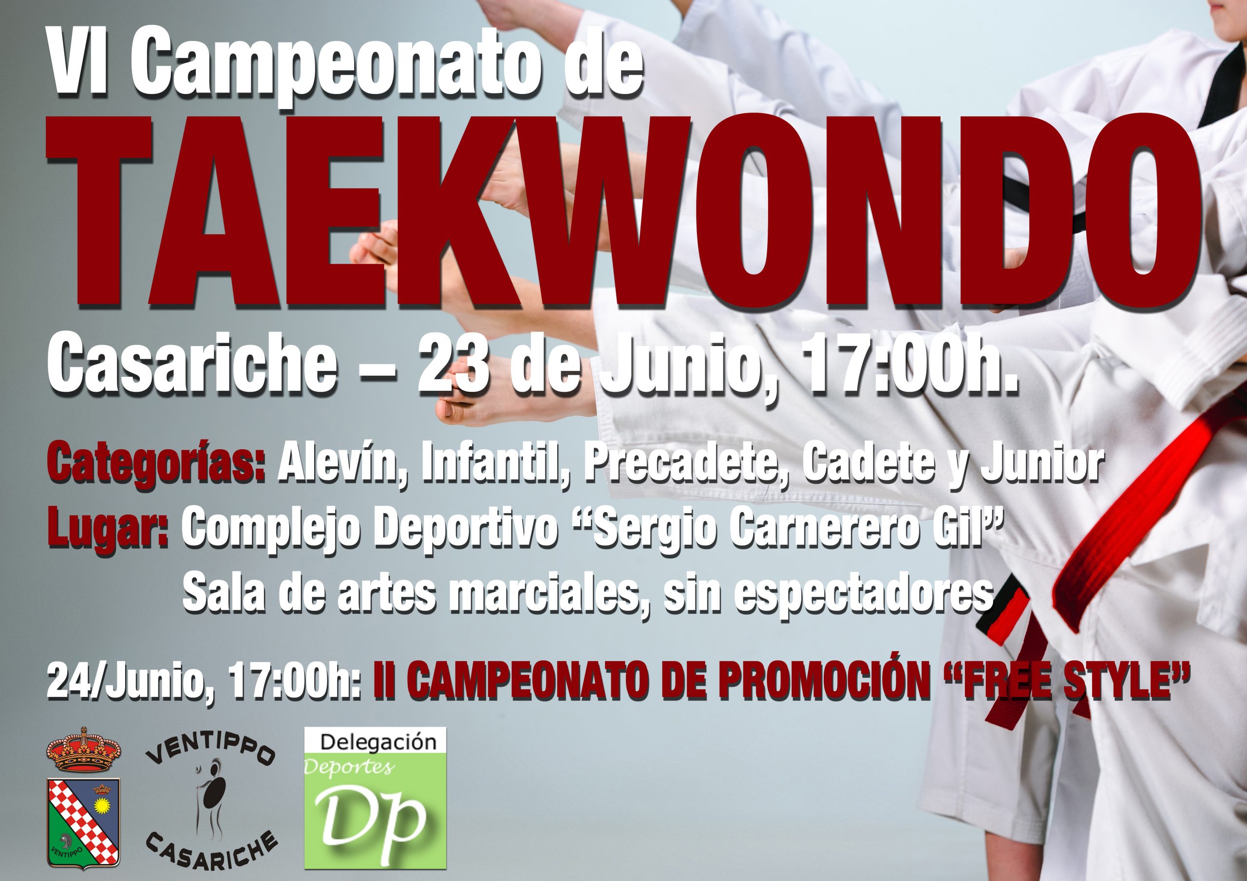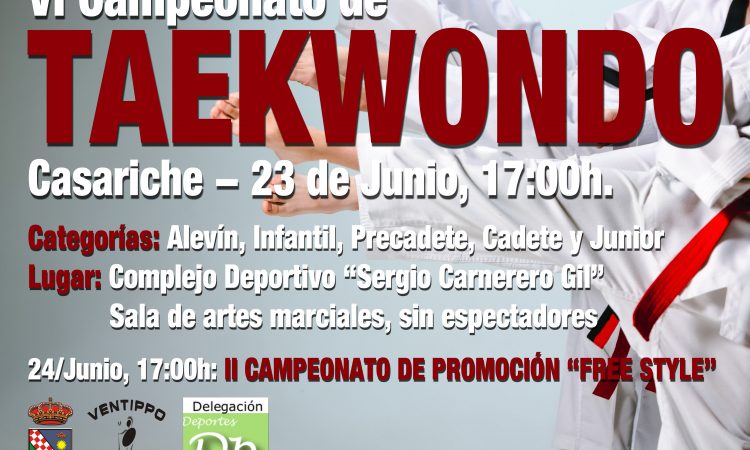 La Delegación de Actividad Física y Deportes informa que el VI Campeonato de Taekwondo de Casariche se celebrará el miércoles 23 de Junio. Será a partir de las 17:00 h en la Sala de artes marciales, ubicada en el Complejo Deportivo Sergio Carnerero Gil, y se llevará a cabo sin espectadores.