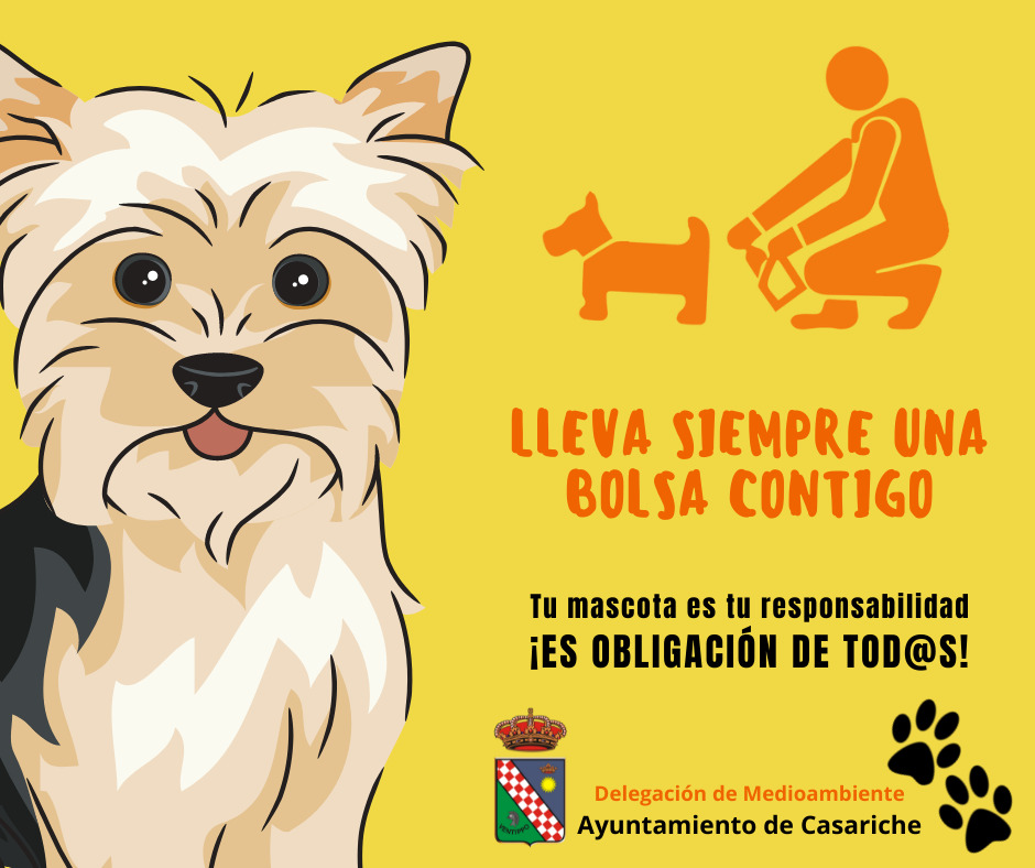 La Delegación de Medio Ambiente del Ayuntamiento de Casariche ha puesto en marcha la campaña “Lleva siempre una bolsa contigo”, recordando que los dueños de mascotas deben velar para que sus animales realicen sus deposiciones en lugares habilitados al efecto, como el parque canino con el que cuenta nuestra localidad, pero que, en caso de que las hagan en la calle, están obligados a recoger los excrementos en bolsas y depositarlas en contenedores o papeleras.