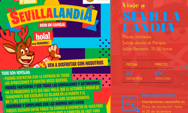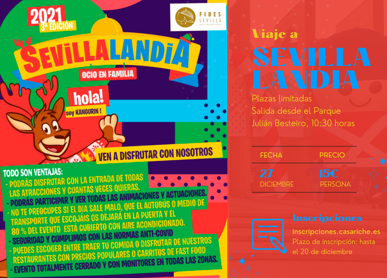 Dentro de la programación navideña de Casariche 2021, abrimos hoy las inscripciones para participar en una propuesta muy atractiva para toda la familia: un viaje a Sevillandia, el mayor parque de ocio familiar cubierto, donde volver a vivir la ilusión de la Navidad. El día elegido es el lunes 27 de Noviembre.