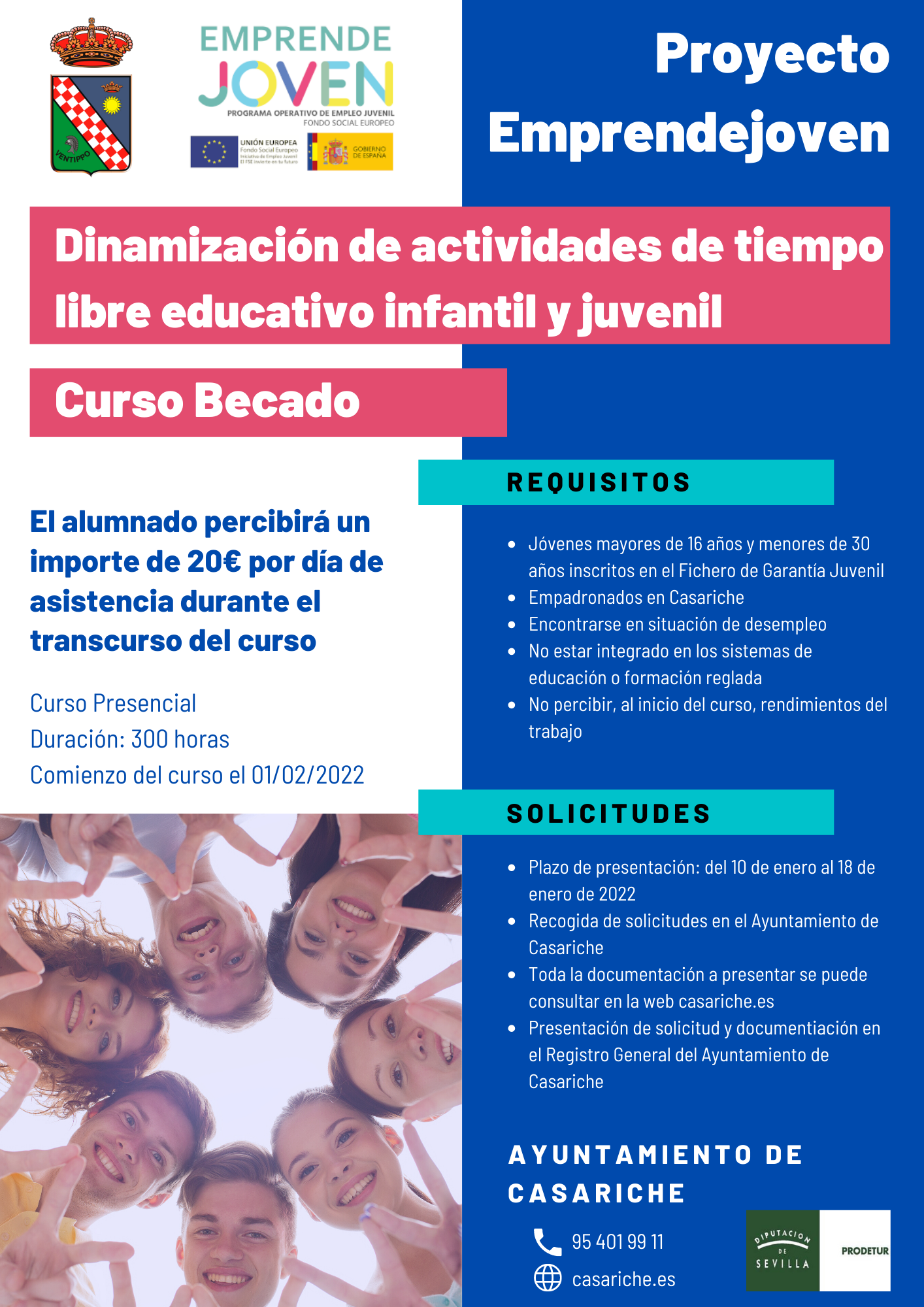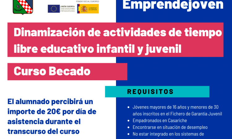 Desde la Delegación de Empleo y Formación del Ayuntamiento de Casariche, queremos comunicar que se va a impartir en nuestro municipio un curso de «Dinamización de actividades de tiempo libre educativo infantil y juvenil», enmarcado en el proyecto Emprendejoven. Se trata de un curso de carácter presencial y becado, en el que el alumnado percibirá un importe de 20 Euros por día de asistencia durante el transcurso del mismo.