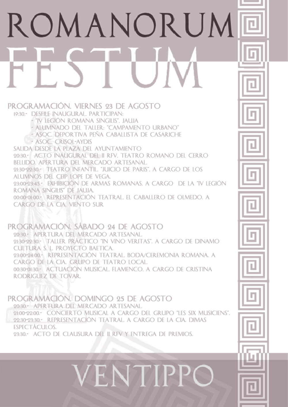 Una actividad promocional del II Romanorum Festum Ventippo ha cerrado la mañana, invitando a los asistentes a visitar la segunda edición de esta fiesta romana (del 23 al 25 de Agosto) en las Canteras Romanas del Cerro Bellido, incluyendo reparto de folletos informativos y degustación de vino romano (sin alcohol) para todos los allí presentes (Ver Programación II Romanorum).
