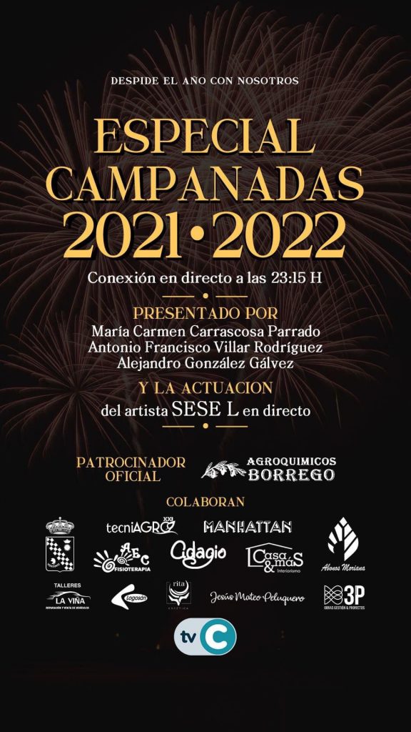 Recordamos, que a partir de las 23:15 horas, TV Casariche emitirá un programa especial en directo para que las campanadas de nuestro pueblo lleguen a muchas de las casas de nuestras vecinas y vecinos. El acto estará presentado por Mª Carmen Carrascosa, Antonio F. Villar y Alejandro González, y además contará con la actuación del artista local «SESE L».