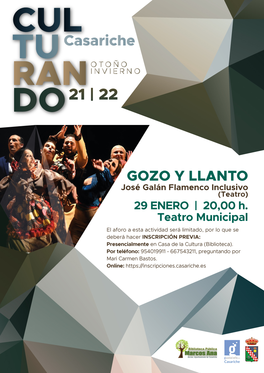 La primera de las actividades enmarcada en el programa Otoño Invierno Culturando de Casariche 2021/2022 de este año es el teatro «Gozo y Llanto», a cargo de José Galán Flamenco Inclusivo, que se celebrará el sábado 29 de Enero, a partir de las ocho de la tarde, en el Teatro Municipal.