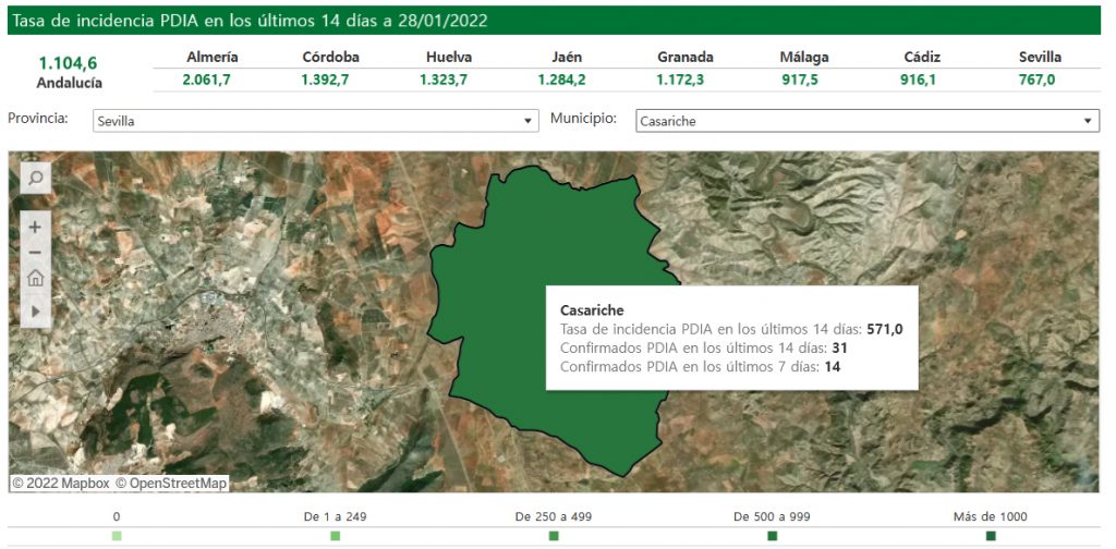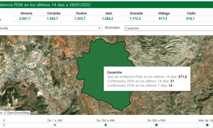 Según los datos del Instituto de Estadística y Cartografía de Andalucía, y de la Consejería de Salud y Familias, los «casos activos positivos» de los últimos 7 días son 14, y de las últimas 2 semanas son 31 casos.