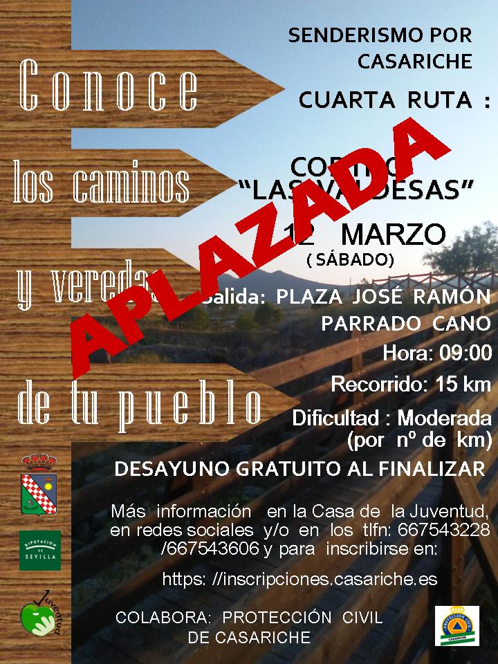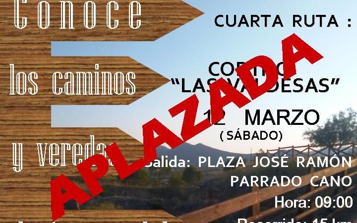 La Delegación de Juventud de nuestro Ayuntamiento informa que la ruta al ‘Cortijo de las Valdesas’, prevista para mañana sábado 12 de Marzo, ha sido aplazada debido a las previsiones de lluvia, especialmente para esta tarde, que van a dar lugar a que los caminos y el campo no estén en condiciones para hacer la ruta de forma segura mañana.