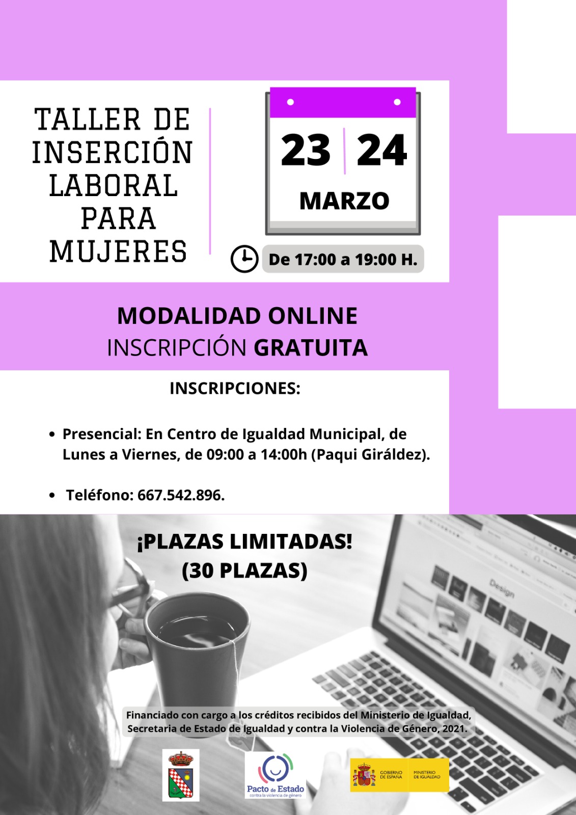 Ya puedes inscribirte en el I Taller de Inserción Laboral para Mujeres, que se llevará a cabo los días 23 y 24 de Marzo en horario de 17:00 h a 19:00 h y en modalidad online.