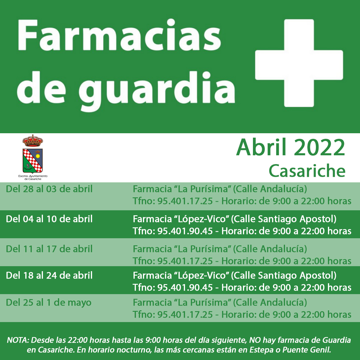 Con el fin de que nuestr@s vecin@s puedan saber en todo momento qué farmacia está de guardia en nuestro municipio, el Ayuntamiento pone a su disposición la información sobre las farmacias de guardia durante el mes de Abril, incluyendo sus números de teléfono y el horario de apertura que tienen.
