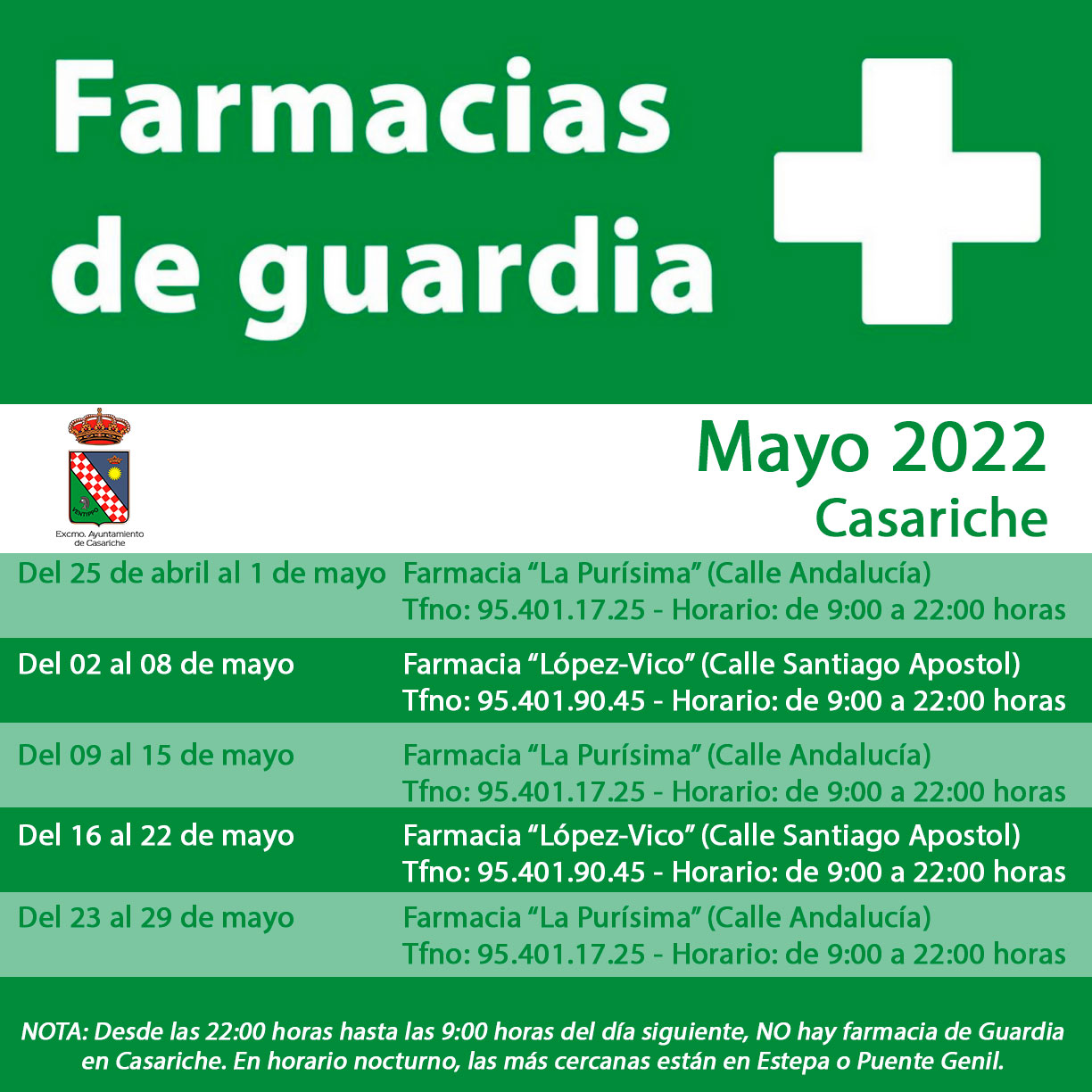 Con el fin de que nuestr@s vecin@s puedan saber en todo momento qué farmacia está de guardia en nuestro municipio, el Ayuntamiento pone a su disposición la información sobre las farmacias de guardia durante el mes de Mayo, incluyendo sus números de teléfono y el horario de apertura que tienen.