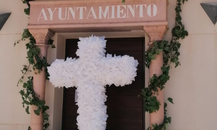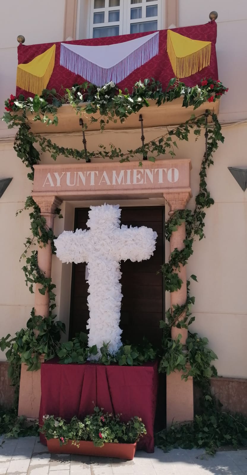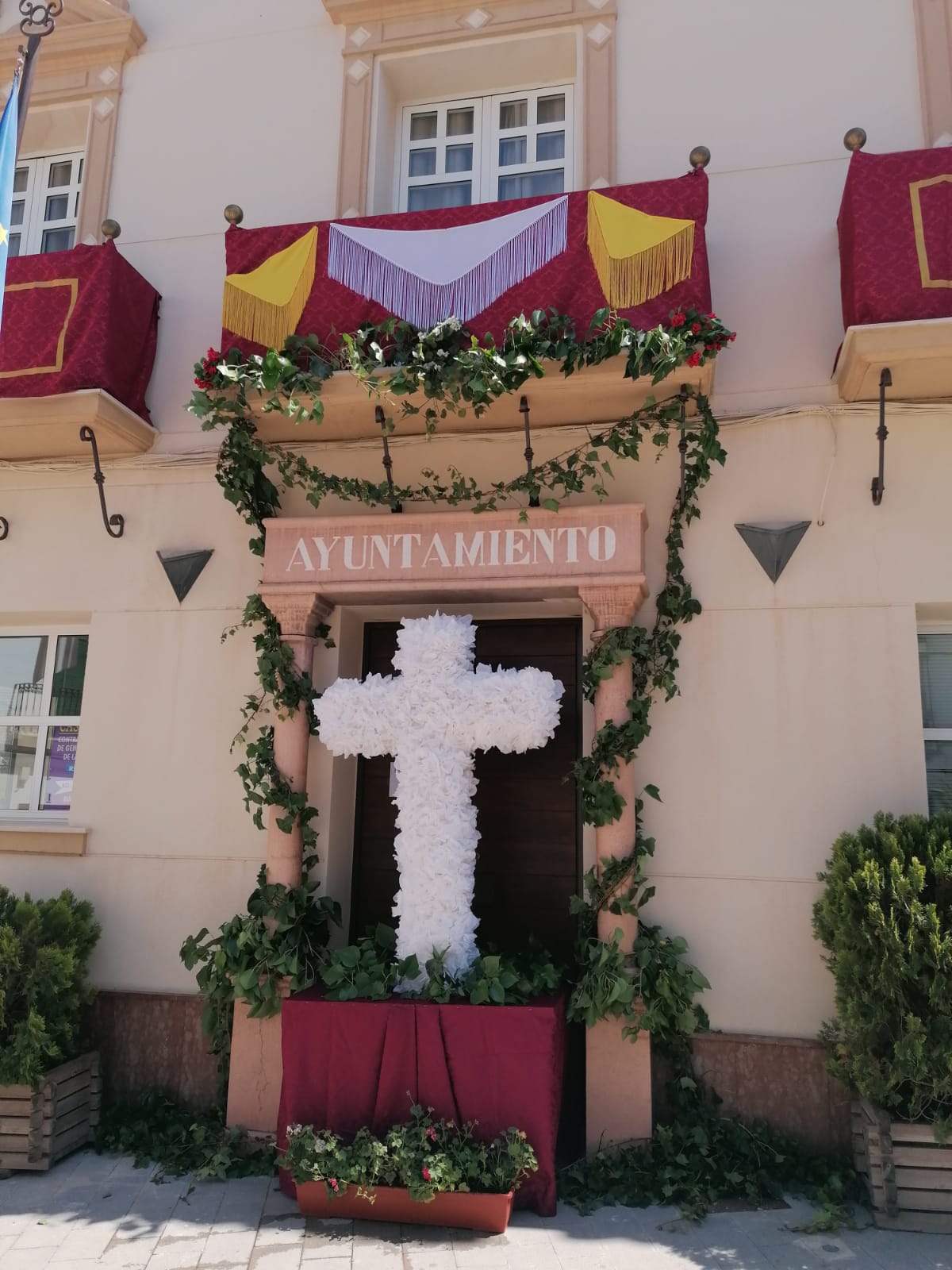 La plaza de nuestro Ayuntamiento luce ya engalanada para la Santa Cruz, que mañana 7 de Mayo recorrerá las calles de nuestro pueblo portada por jóvenes costaleros de Casariche con el acompañamiento musical de la Agrupación Musical «Dulce Nombre de Jesús» de Marchena (Sevilla).
