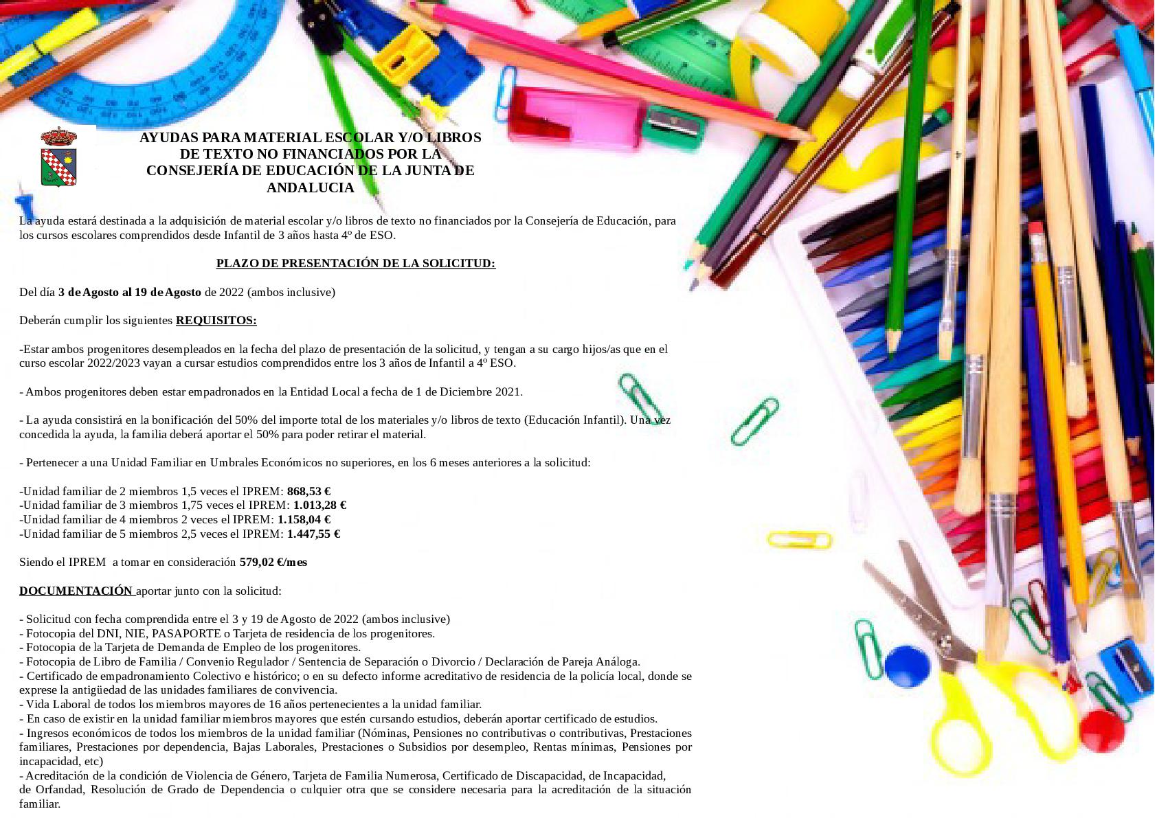 El Ayuntamiento de Casariche ha puesto en marcha la convocatoria de ayudas para la adquisición de material escolar y/o libros de texto no financiados por la Consejería de Educación de la Junta de Andalucía para los cursos escolares comprendidos desde Educación Infantil de 3 años hasta 4º de ESO (curso 2022-2023).